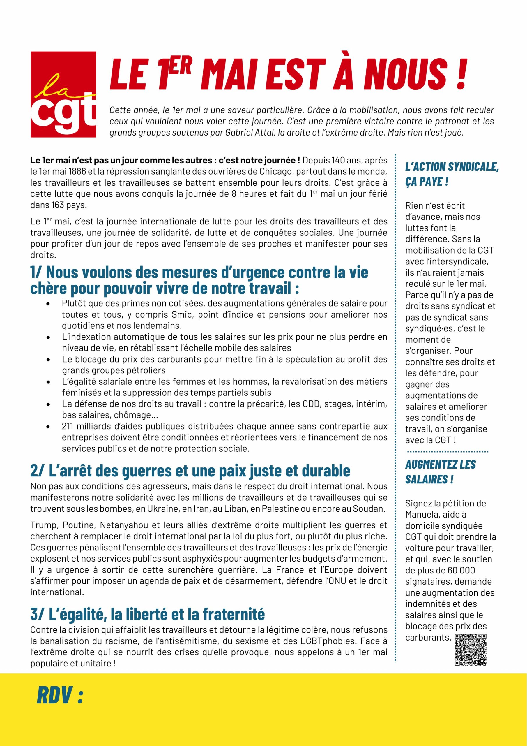 La CGT appelle les travailleuses et les travailleurs à manifester massivement ce 1er mai. C’est NOTRE journée, c’est le jour où se faire entendre pour exiger des augmentations de salaire et des mesures contre la vie chère. C’est le jour où, depuis 140 ans, tous les travailleurs et travailleuses du monde manifestent ensemble pour défendre la paix juste et durable et le progrès social.