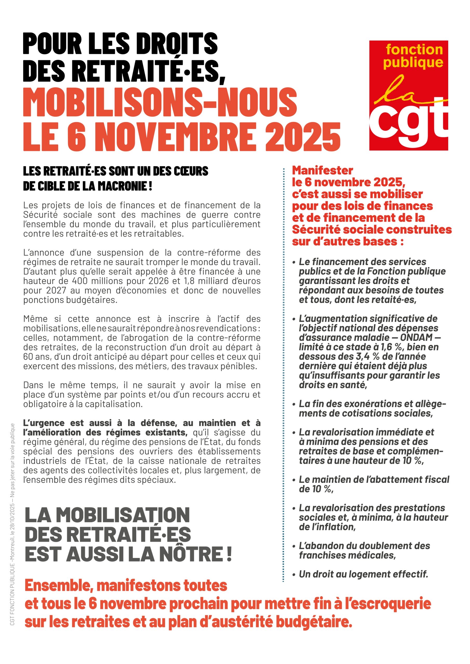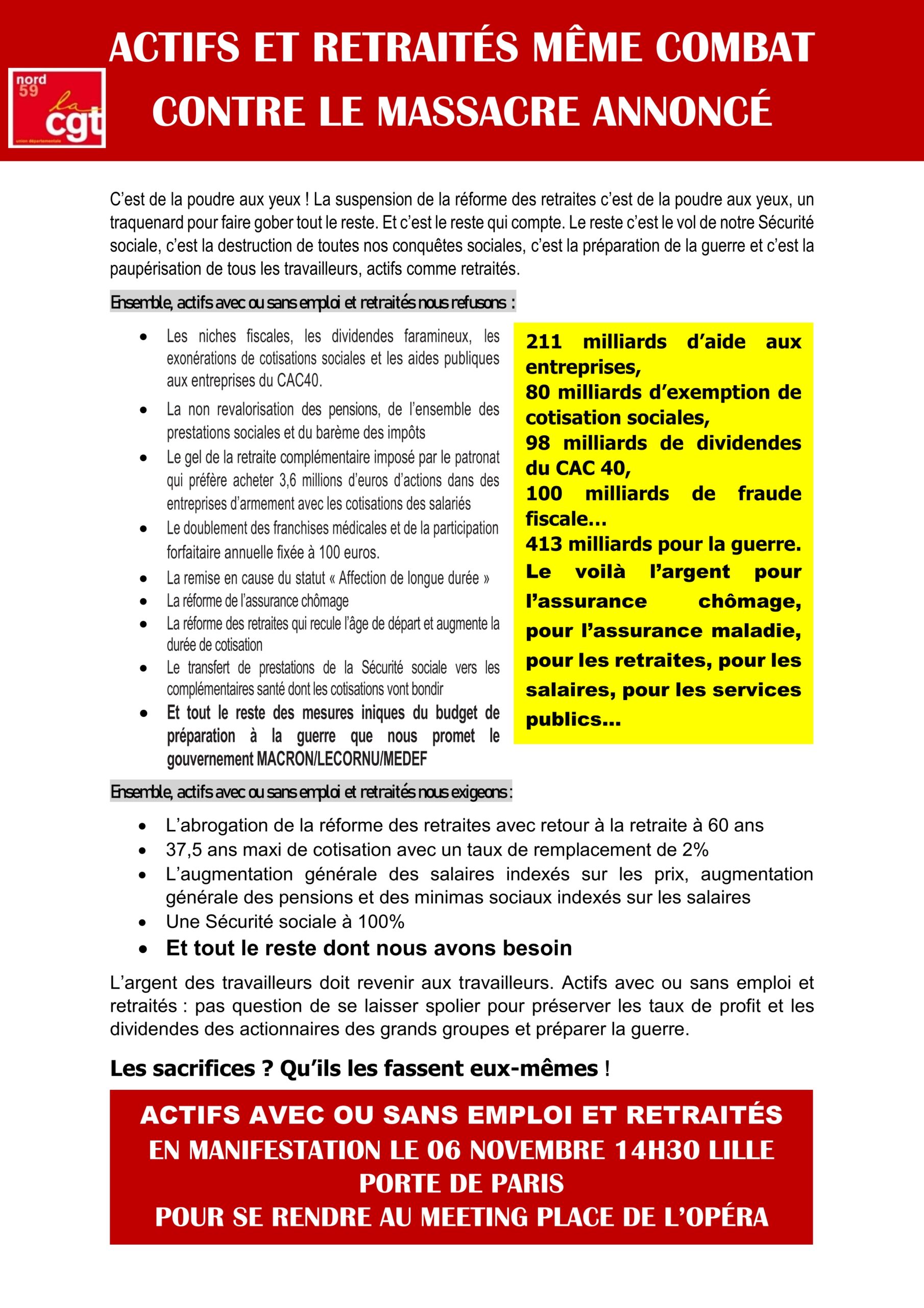 Mobilisation jeudi 06 novembre 2025 sur les retraites et le projet de loi de finance. Manifestation 14h30, Porte de Paris à Lille. 3 novembre 2025 Mis en avant
